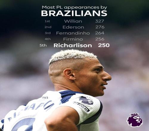 本场比赛,热刺前锋里沙利松在英超中达到了一个重要的里程碑——他成为了第五位在英超联赛中出场达到250次的巴西球员。